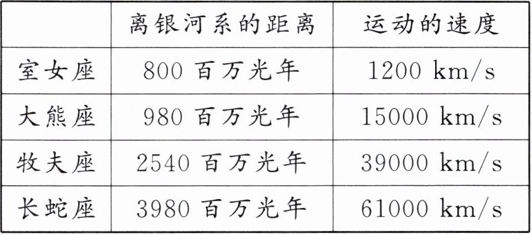 7.随着科技的进步,黑洞理论和宇宙无边界的设想,正逐步得到证实。室女座、大熊座、牧夫座和长蛇座四大星系离银河系的距离与它们的运动速度见下表。
