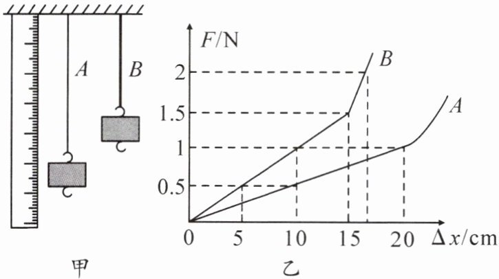11.为研究橡皮筋是否与弹簧有类似的性质,某兴趣小组的同学对A、B两根长度相同粗细不同的橡皮筋进行研究,并做成橡皮筋测力计。将橡皮筋的一端固定,另一端悬挂钩码(如图甲),记录橡皮筋受到的拉力大小F和橡皮筋的伸长量$\Delta x$,根据多组测量数据画出的图线如图乙所示。