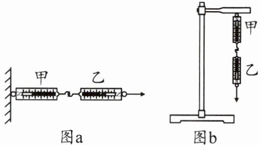 9.如图a所示,甲、乙弹簧测力计自重均为0.5 N,甲弹簧测力计固定在竖直墙壁上,小科用水平向右为9 N的力拉动乙弹簧测力计,此时甲弹簧测力计的示数为______N;小科又将甲弹簧测力计固定在铁架台的铁夹上,如图b所示,仍用9 N的力竖直向下拉动乙弹簧测力计,则此时甲弹簧测力计的示数为______N。(一切摩擦不计)