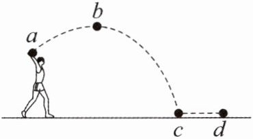 5. 如图所示,是小慧同学掷实心球的场景,图中虚线表示球的运动轨迹,球从 a 点上升到最高点 b 点后下落到地面 c 点,然后继续运动到 d 点停止。下列说法正确的是( )