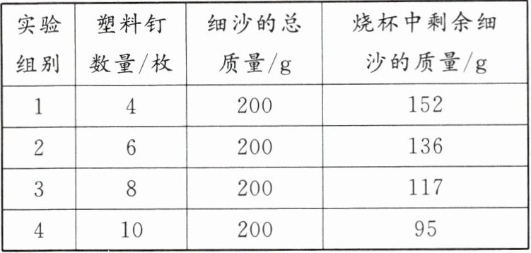 |实验组别|塑料钉数量/枚|细沙的总质量/g|烧杯中剩余细沙的质量/g|