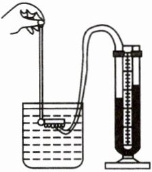 8. 已知$\rho_{红墨水}>\rho_{水}>\rho_{煤油}$。右图所示是常用的液体压强计,烧杯中装的是水,金属盒处于此位置时 U 形管两边的液面高度差为$h_{1}$,如果将烧杯中的液体换成等体积的煤油并保持金属盒的位置不变,U 形管两边的液面高度差变为$h_{2}$,则$h_{1}$______$h_{2}$(填“>”“<”或“=”,下同)。如果烧杯中的水和金属盒的位置不变,将 U 形管中的红墨水换成煤油,U 形管两边的液面高度差变为$h_{3}$,则$h_{1}$______$h_{3}$。