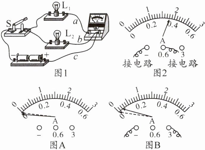 (1)连接电路时,开关必须处于______状态。实验过程中电流表如果出现图 A 所示情况,原因是______,电流表如果出现图 B 所示情况,原因是______。