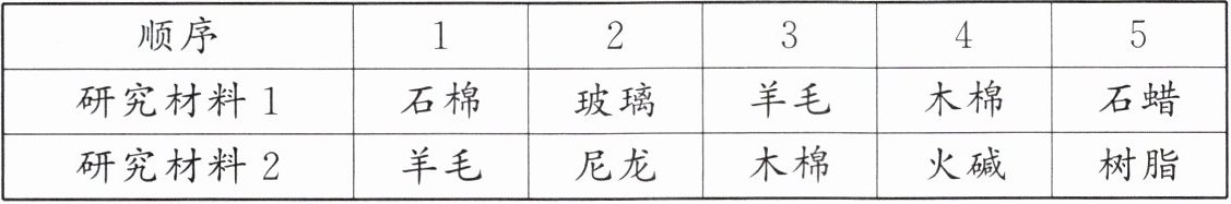 | 研究材料2 | 羊毛 | 尼龙 | 木棉 | 火碱 | 树脂 |