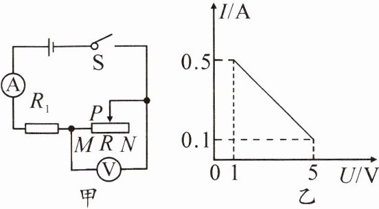 6. 如图甲所示的电路中,电源两端的电压保持不变,闭合开关 S,滑动变阻器 R 的滑片 P 从图中 M 点移动到 N 点的过程中,电流表示数 I 与电压表示数 U 的关系如图乙所示,下列判断正确的是( )
