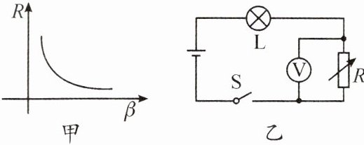 4. 如图甲所示为气敏电阻随有害尾气浓度$\beta$变化的曲线,某物理科技小组利用气敏电阻设计了汽车有害尾气排放检测电路,如图乙所示,电源电压恒定不变,R 为气敏电阻,L 为指示灯。当有害尾气浓度$\beta$增大时( )
