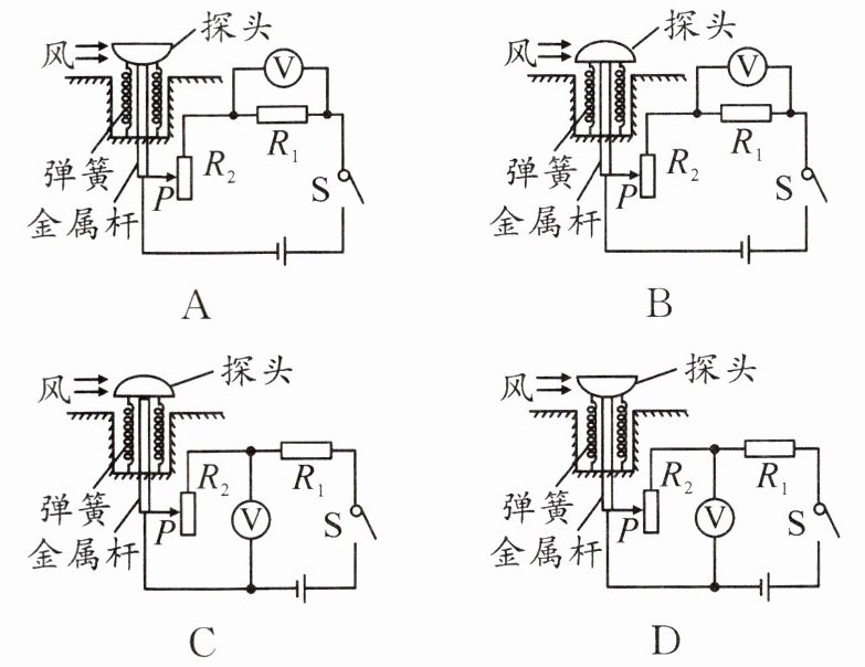 5. 如图是某同学设计的测风速的装置,图中探头、金属杆和滑动变阻器的滑片 P 相连,可上下移动。现要求:当风吹过探头时,滑动变阻器的滑片 P 向上移动,且风速增大时电压表的示数增大。以下四个图中符合要求的是( )