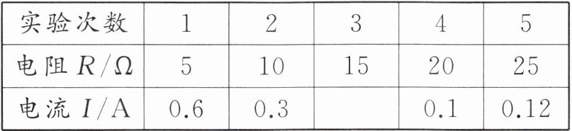 | 电阻R/Ω | 5 | 10 | 15 | 20 | 25 |