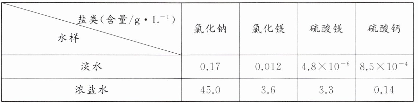 (2)某工厂淡化海水后得到的浓盐水和淡水中盐类物质含量如表(微量盐类忽略不计)。国家规定居民生活用水中盐类物质总含量≤$500\ mg·L^{-1}$,计算并推断所得淡水中盐类总含量______(填“达到”或“未达到”)生活用水的标准;该工厂一套淡化装置每小时产生浓盐水300 L,其中含有氯化钠______kg。