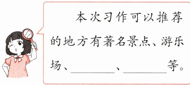 本次习作可以推荐的地方有著名景点、游乐场、______、______等。
