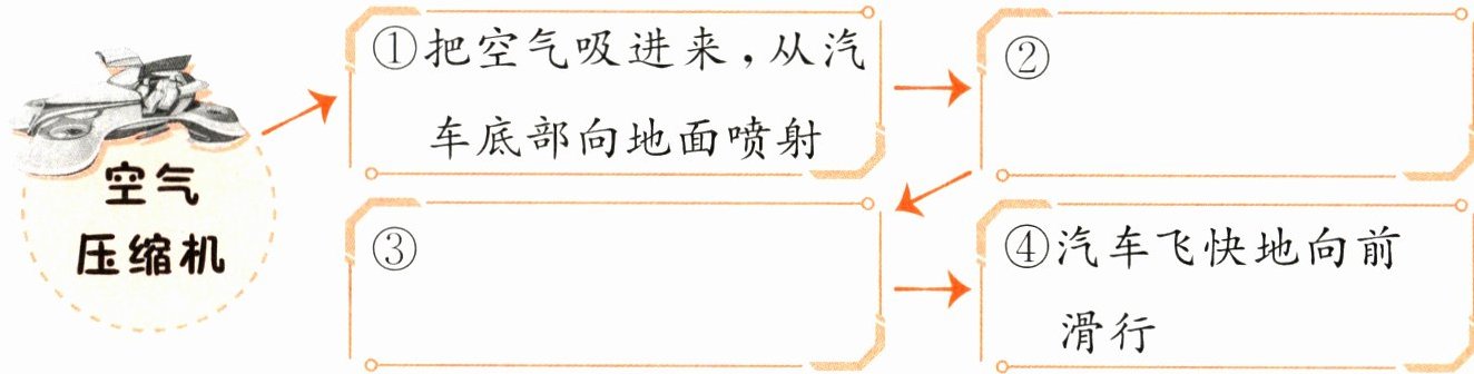 ③这种汽车是用什么东西来代替轮子的呢?也是用看不见、摸不着的压缩空气。这种汽车的构造并不复杂。装在汽车里的空气压缩机把空气吸进来,然后把它从汽车的底部向地面喷射,力量强大的压缩空气就把汽车“举”了起来,使汽车和地面保持一定的距离;另外,再把一股压缩空气从车尾喷出去。这时,汽车就会像喷气式飞机一样,飞快地向前滑行。