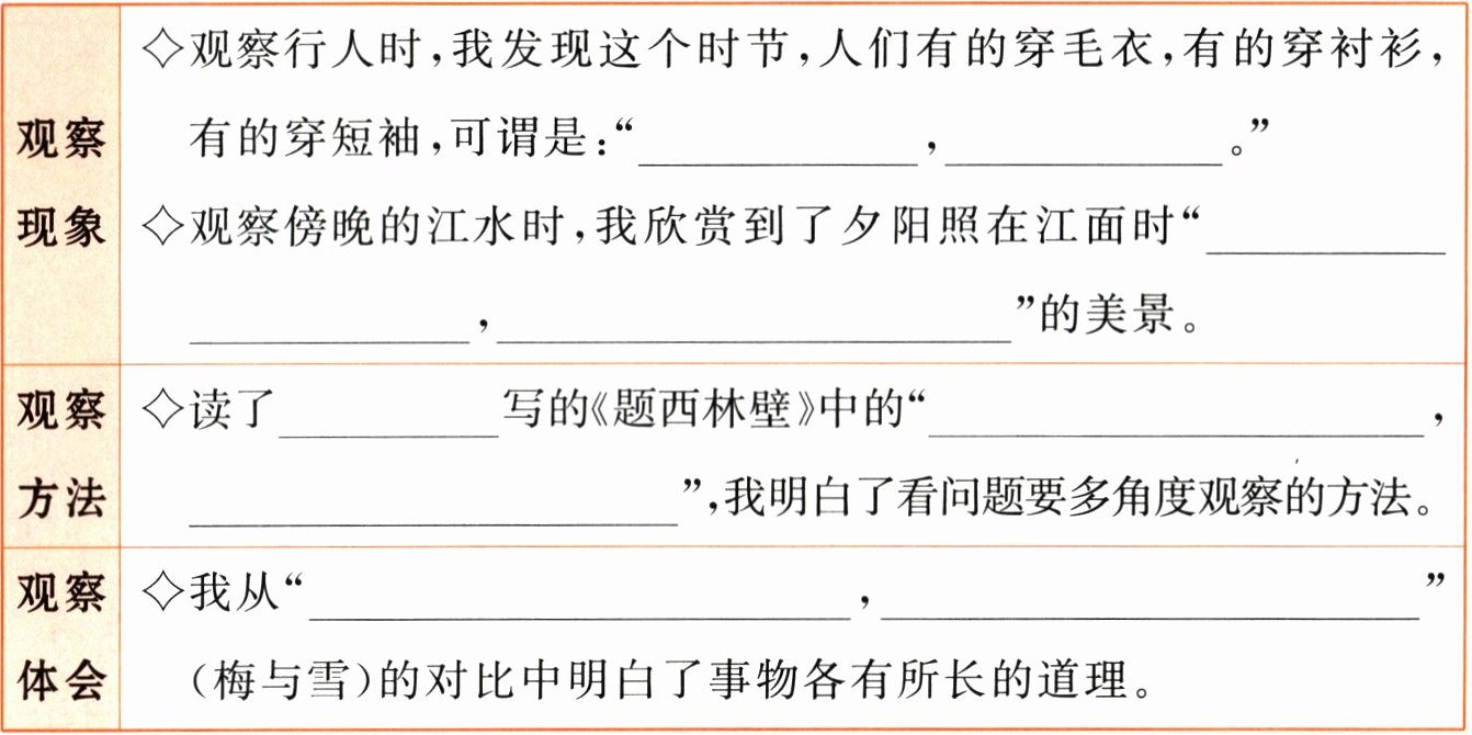 | 观察现象 | ◇观察行人时,我发现这个时节,人们有的穿毛衣,有的穿衬衫,有的穿短袖,可谓是:“______,______。”◇观察傍晚的江水时,我欣赏到了夕阳照在江面时“______,______”的美景。 |