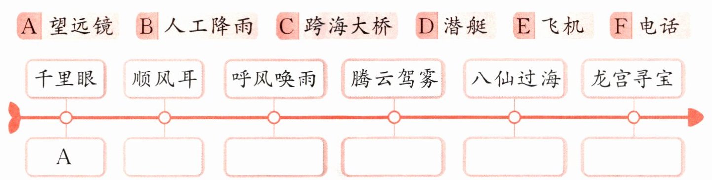 A 望远镜 B 人工降雨 C 跨海大桥 D 潜艇 E 飞机 F 电话