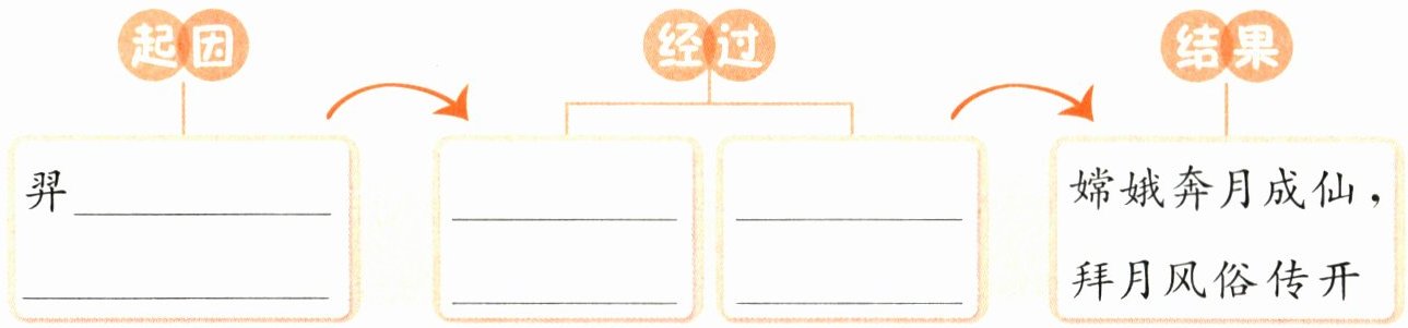 起因→羿______→经过→______ →______→结果→嫦娥奔月成仙,拜月风俗传开