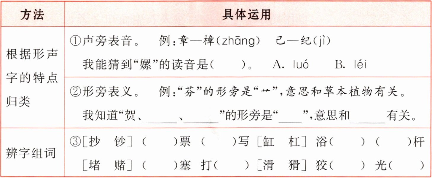 |根据形声字的特点归类|①声旁表音。 例:章—樟(zhāng) 己—纪(jì)我能猜到“螺”的读音是( )。 A. luó B. léi②形旁表义。 例:“芬”的形旁是“艹”,意思和草本植物有关。我知道“贺、____、____”的形旁是“____”,意思和____有关。|