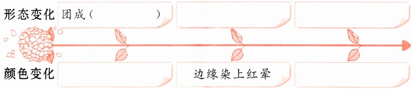 \begin{tabular}{|c|c|c|}\hline $形态变化 & 团成$( ) & \\\hline $颜色变化 & & 边缘染上红晕$ \\\hline\end{tabular}\\\hline $