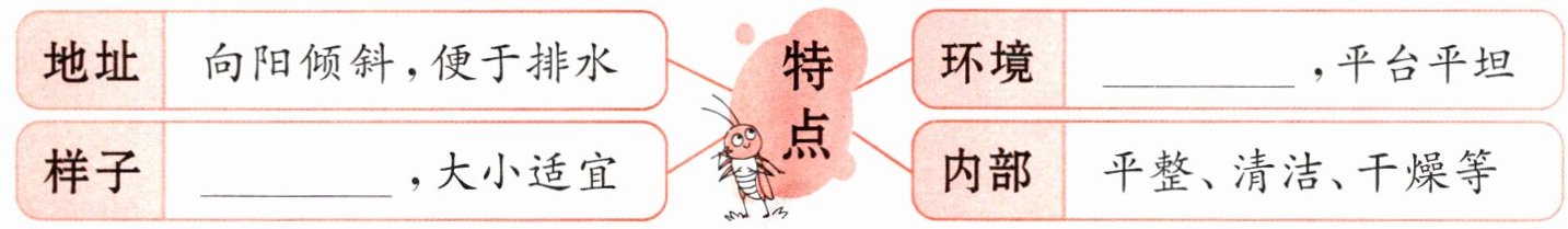 (3)结合选文,梳理蟋蟀的住宅的特点,补全思维导图。