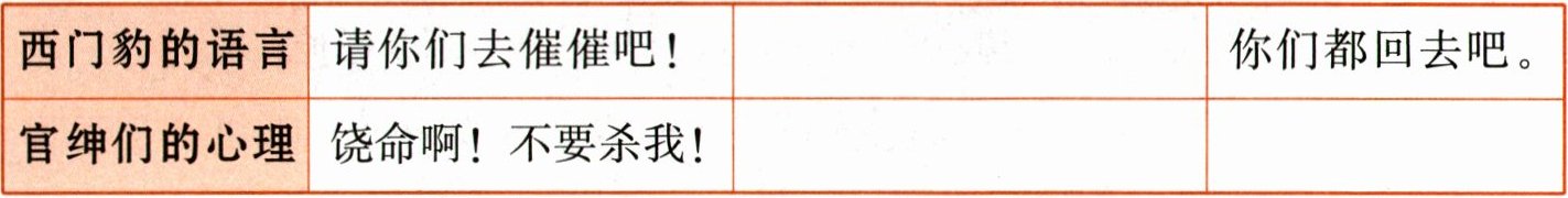 13. 关注西门豹的语言,推测官绅们的心理,想一想,补全表格。(3分)