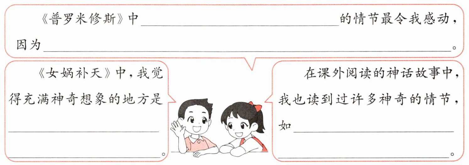 三、【神话交流厅】同学们正交流对神话故事情节的感悟,补全对话。