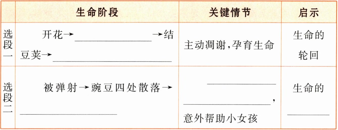 |选段一|开花→____→结豆荚→____|主动凋谢,孕育生命|生命的轮回|