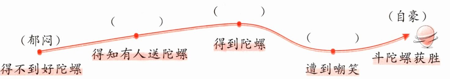 解析 完成本题,一是要按照事情发展的顺序读通故事内容,二是要抓住文章主线理清文章层次,三是要抓住重点语句感受情节变化和人物心情的变化。本文以“陀螺”为线索,生动形象地写出了“我”与同伴斗陀螺的过程,可以根据提示在文中找到情节变化和“我”心情的变化。