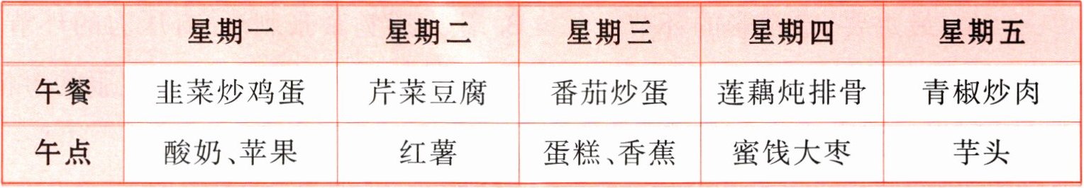 | 午点 | 酸奶、苹果 | 红薯 | 蛋糕、香蕉 | 蜜饯大枣 | 芋头 |