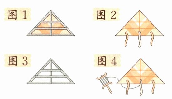 (1)(从上到下)竹子 棉线 报纸 面浆 糊上报纸 图1 制作尾巴 图2 装上线轴 图4 分工合作,一人在后面举着风筝,一个人在前面牵着线跑 风向 风的大小 放手的时机