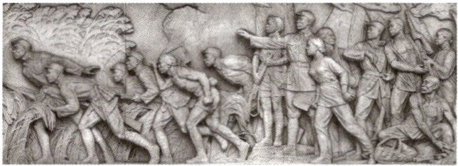 这幅浮雕刻画了 (面)的场景。前面的八路军战士拿着枪,弯着腰穿过茂密的青纱帐,一位农民肩上扛着弹药箱跟在队伍后面。中间高台上是一位指挥员,他 。最后面的一位大娘把枪送到儿子手中,好像在说:“ ”