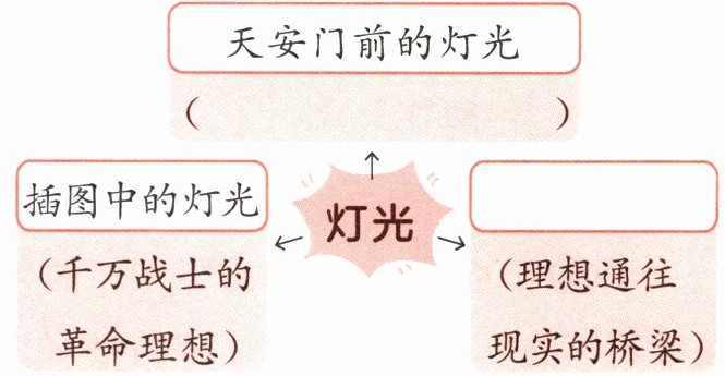 解析 补全思维导图时,通过回顾课文内容,找到关于“灯光”的语句,并联系上下文,分析“灯光”代表的不同意义。按照课文的写作顺序分析:第一处,“广场上无数盏灯静静地照耀着周围的宏伟建筑,令人心头光明而又温暖”,此刻已经是和平年代,这时的“灯光”是温暖、光明的,这是千万战士把革命理想变为了现实;第二处,“书上有一幅插图,画的是一盏吊着的电灯,一个孩子正在灯下聚精会神地读书”,此时的“灯光”是“千万战士的革命理想”,这个理想还没有成为现实;第三处,“突然,黑暗里出现一星火光,一闪,又一闪”,这里的光,是郝副营长点燃的书的火光,像明灯一样帮战士们找到突破口,这是郝副营长的壮举,也是理想通往现实的桥梁。选择题的 B 项,课文以“灯光”为题,核心是通过灯光连接过去(革命理想)与现在(幸福生活),强调要珍惜来之不易的幸福生活、铭记先烈,而非“表现生活的温暖”,理解错误。