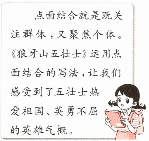 点面结合就是既关注群体,又聚焦个体。《狼牙山五壮士》运用点面结合的写法,让我们感受到了五壮士热爱祖国、英勇不屈的英雄气概。