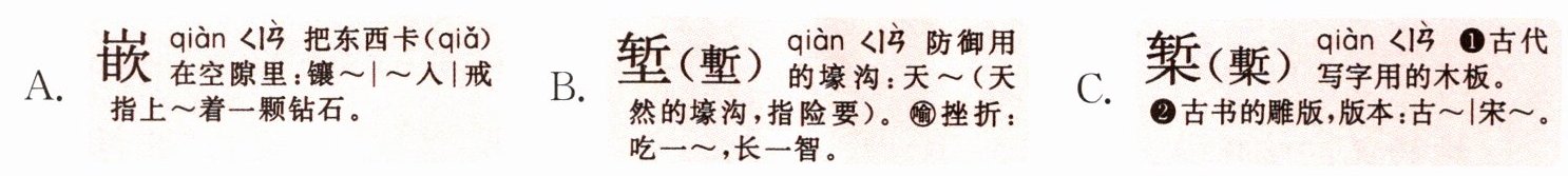 B. 堑(塹) qiàn〈名〉防御用的壕沟:天~(天然的壕沟,指险要)。〈动〉挫折:吃一~,长一智。