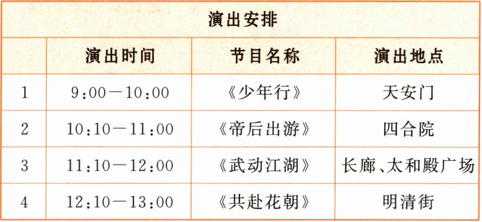 (3)从入口进入景区后,可以依次在天安门、四合院、太和殿广场、明清街观看四场不同的演出,路线连贯,距离近。