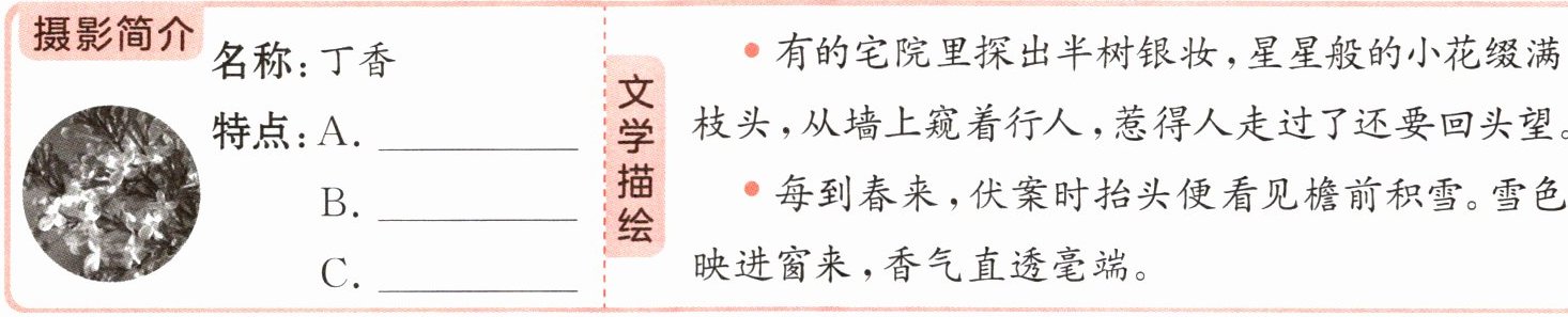 (1)明明阅读“文学描绘”后发现,宗璞用视觉、嗅觉两种感官,从______、______和______三个方面描写了丁香的特点。请你帮他概括出具体特点,补全“摄影简介”。