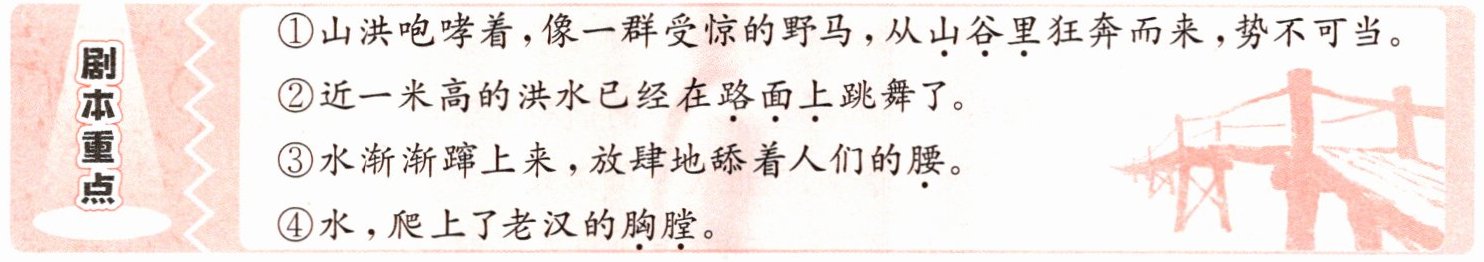 (5)句②中有三个“!”,这部分台词要说得坚定有力。老汉的话是想告诉人们:①情况——危急;②撤离方式—— ;③逃生原则—— 。