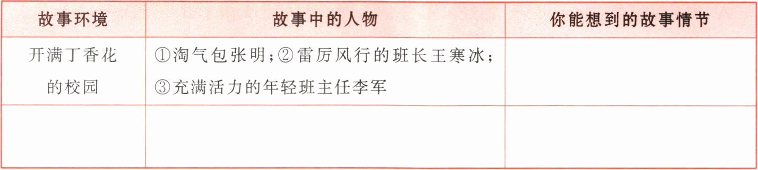 | 故事环境 | 故事中的人物 | 你能想到的故事情节 |
