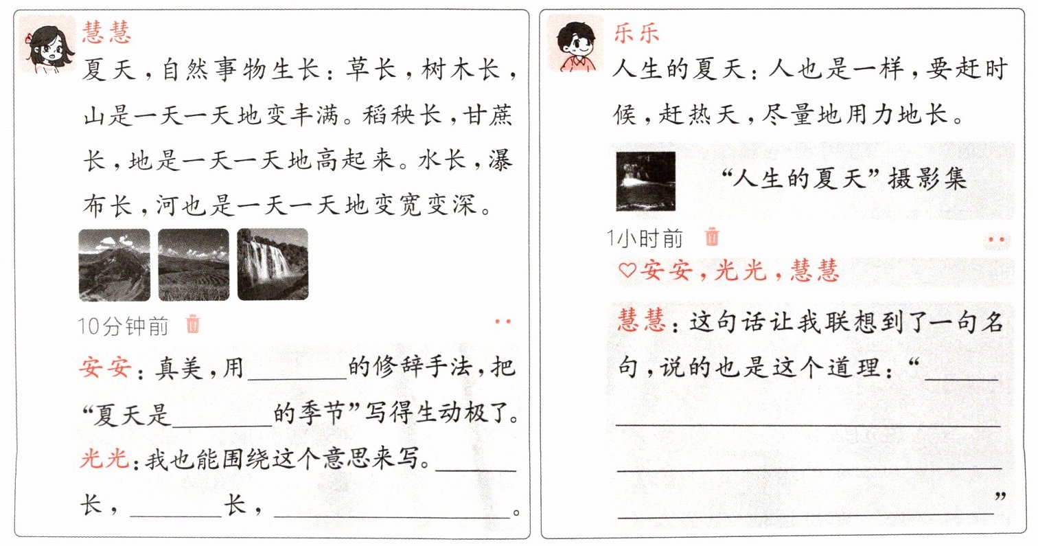 3 【妙语赞夏天】同学们纷纷用妙语赞美夏天,请你参与,完成练习。