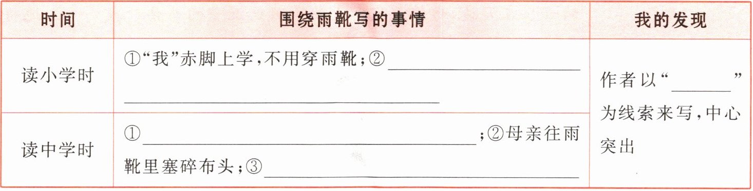 |读小学时|①"我"赤脚上学,不用穿雨靴;②______|作者以"_____"为线索来写,中心突出|