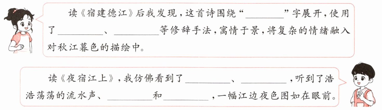 读《宿建德江》后我发现,这首诗围绕“______”字展开,使用了______、______等修辞手法,寓情于景,将复杂的情绪融入对秋江暮色的描绘中。