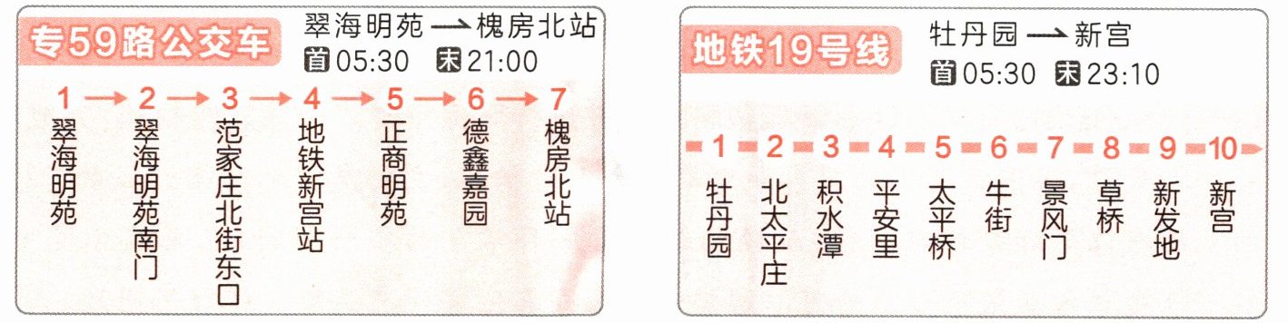 3 方方家住草桥,计划利用公共交通前往南苑森林湿地公园。请根据以下材料完成练习。