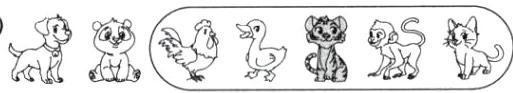 (2)从左边数,给第5只小动物涂上颜色。把右边的5只小动物圈起来。