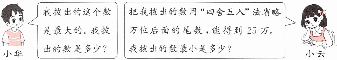➔第二空:根据近似数是25万,可知原数万级上最小是“24”,此时是运用“五入”法求出的近似数,所以千位上的数字不小于5,最小是5。