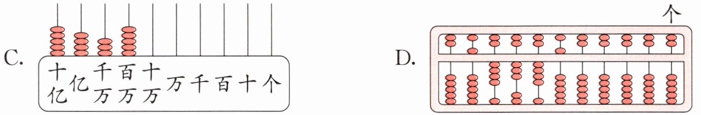 (6)小维在算盘的十亿位上拨了 1 颗上珠和 2 颗下珠,千万位上拨了 3 颗下珠,千位上拨了 1 颗上珠和 3 颗下珠,其他数位上不拨珠。他拨出来的数是(