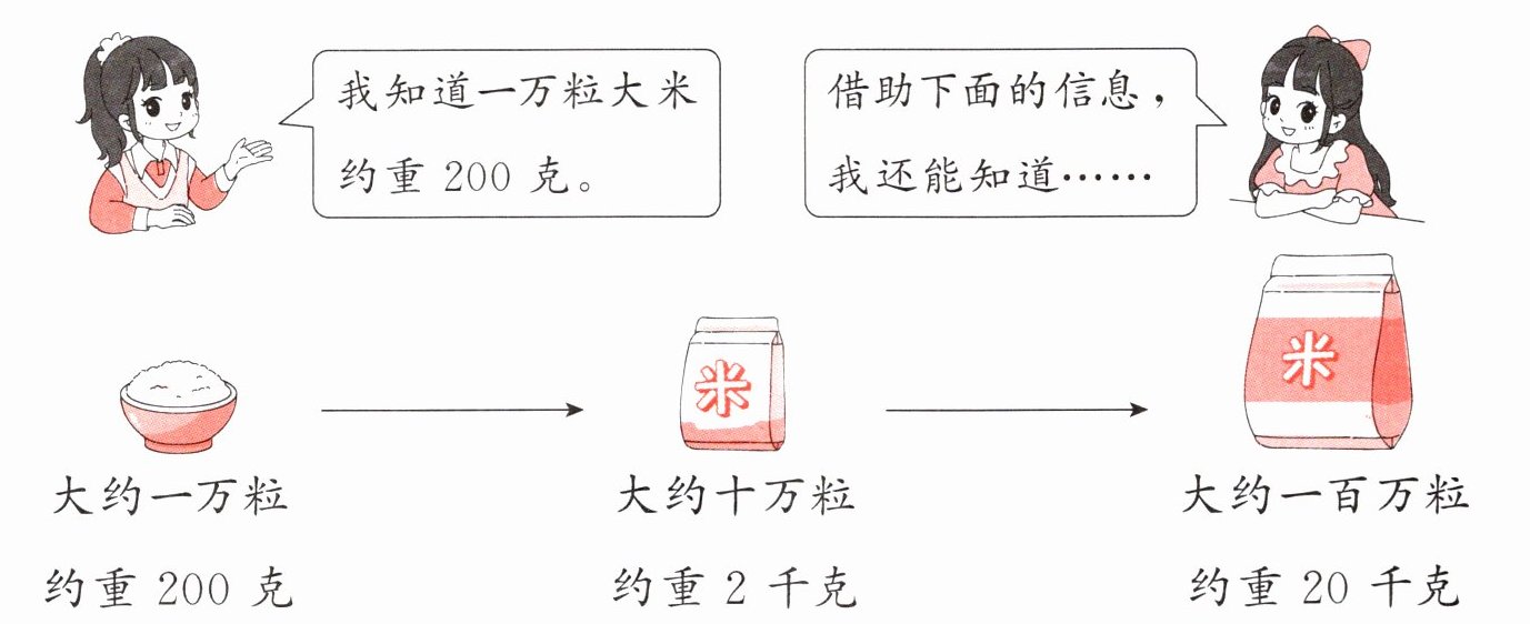 (1)2000 解析 根据题图可知,一百万粒大米约重20千克,那么一千万粒大米约重200千克,一亿粒大米约重2000千克。