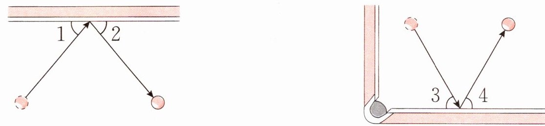 (2)相等 解析:∠1和∠3是台球撞向桌边时与桌边形成的角,∠2和∠4是台球弹走后与桌边形成的角,通过测量知道:∠1 = ∠2,∠3 = ∠4。由此发现:台球撞向桌边时与桌边形成的角的度数等于台球弹走后与桌边形成的角的度数。