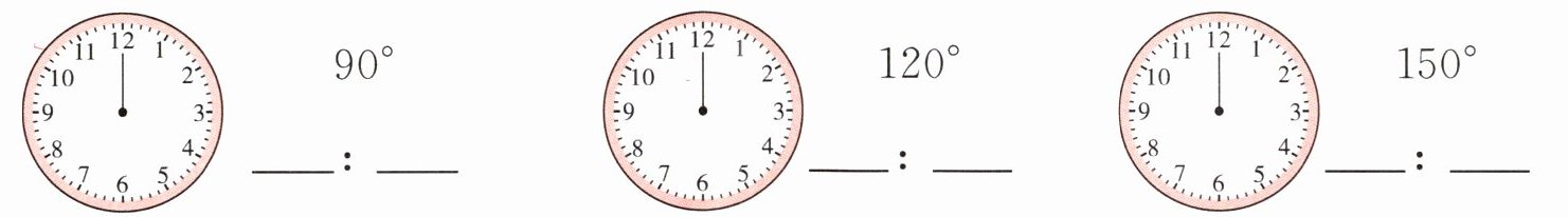 5 钟面上的时针和分针不停地转动,可以组成许多大小不同的角。按照给出的度数,画出相应的时针,并写出表示的时间。