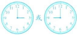 5:00或7:00或17:00或19:00 解析:钟面上有12个大格,因为12×30° = 360°,所以每个大格对应的夹角是30°。第一个图:3×30° = 90°,即3个大格对应的夹角是90°;分针指向“12”,说明表示的时间是整时,此时时针应指向“3”或“9”。第二个图:4×30° = 120°,即4个大格对应的夹角是120°;分针指向“12”,说明表示的时间是整时,此时时针应指向“4”或“8”。第三个图:5×30° = 150°,即5个大格对应的夹角是150°;分针指向“12”,说明表示的时间是整时,此时时针应指向“5”或“7”。