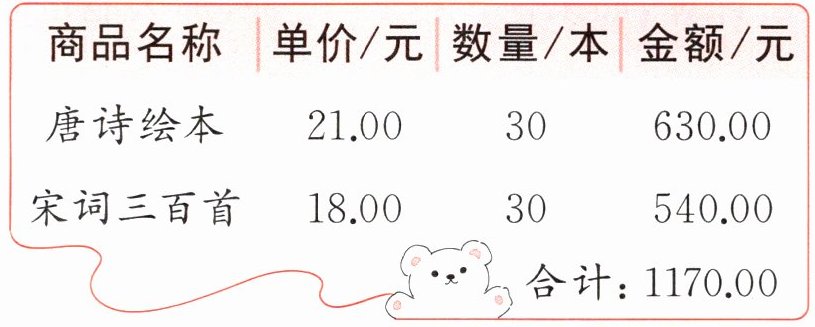 3 学校开展古诗文诵读活动,图书馆先购买了一些《唐诗绘本》和《宋词三百首》,购书清单如下图,现在需要再购买 15 本《唐诗绘本》和 30 本《宋词三百首》,还要花多少钱?