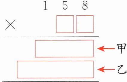 (1)题可知,这个竖式计算的是158×14,所以甲表示158×4 = 632,乙表示158×10 = 1580,632<1580,所以甲<乙。
