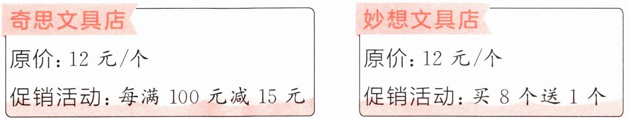 奇思文具店:245×12 = 2940(元) 100×29 = 2900(元) 100×30 = 3000(元) 2900<2940<3000 2940 - 15×29 = 2505(元) 妙想文具店:8 + 1 = 9(个) 245÷9 = 27(组)……2(个) 8×27 + 2 = 218(个) 218×12 = 2616(元) 2505<2616 答:在奇思文具店购买比较优惠。 解析 解答本题时,先分别算出在两家文具店购买245个魔方花的总钱数;然后进行比较,看看在哪家店购买比较优惠。
