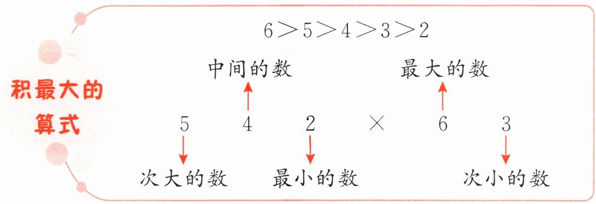 通过探究,我们找到了积最大的算式,算式中的三位数和两位数,每位上放哪个数字是有规律的,规律如下图。